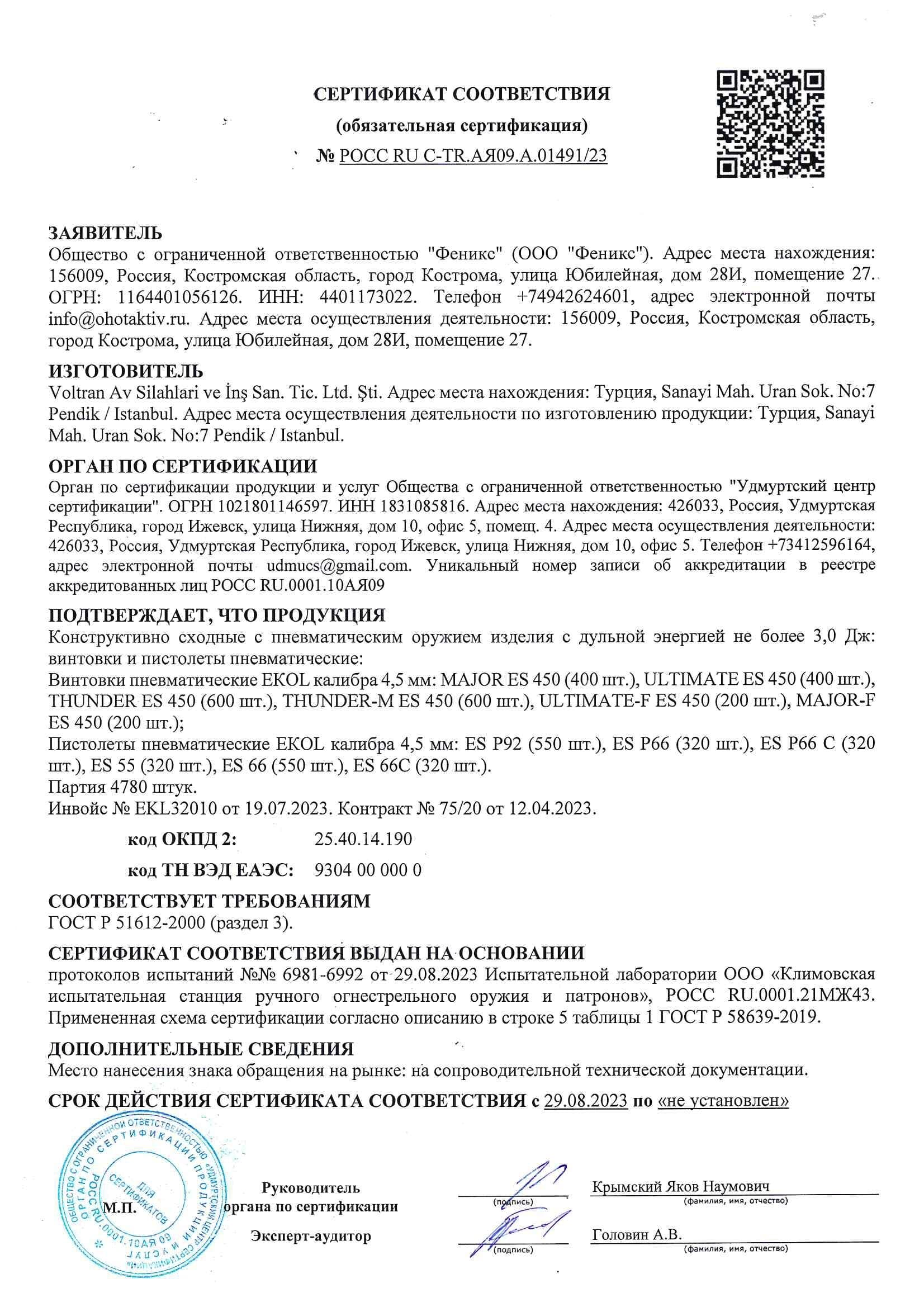 В заводской комплектации Ekol Major имеет невысокую дульную мощность. После каждого выстрела винтовка встает на автоматический предохранитель. Нарезной ствол обеспечивает хорошую скорость выстрела и кучность. Прицельные приспособления открытые, представлены в виде регулируемого целика и мушкой с фибероптическими элементами. Наличие таких устройств позволяет использовать воздушку для точной стрельбы на малых дистанциях.